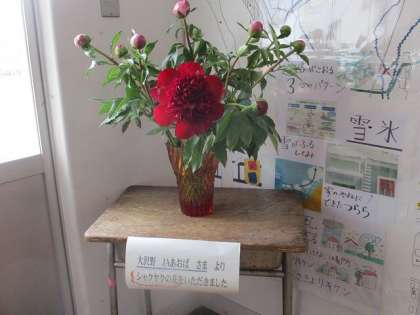 大沢野JAあおば様よりシャクヤクの花をたくさんいただきました。児童玄関、正面玄関など、学校を彩っています。ありがとうございました。
