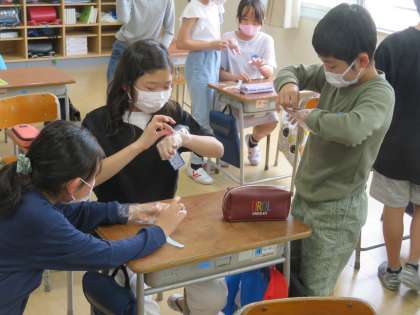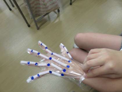 体のはたらきの学習をしています。今日は骨と関節の理解をするため、自分の手の模型を作りました。ビニール手袋の上から関節の位置を確認してシールを貼ります。シールの間は骨のかわりにストローを貼ります。少しづつ完成する模型を見ながら、人体の不思議を感じていた子供たちでした。