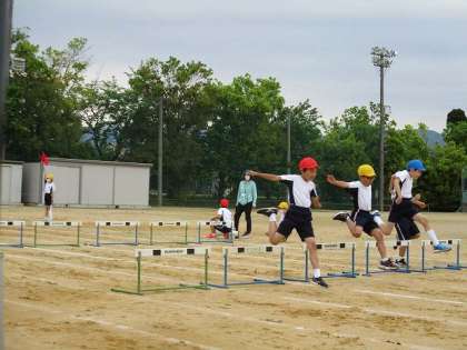 5、6年生の個人走は、50mハードル走です。リズミカルに障害を飛び越えて走りました。