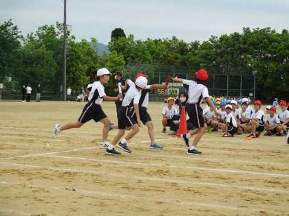 続いて団体競技は、全員リレーです。5年生、6年生とも走順を考え、バトンをつないでいました。