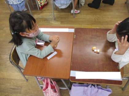 友達と6つのブロックを使って、手の中にあるブロックの数を考えるゲームをしました。