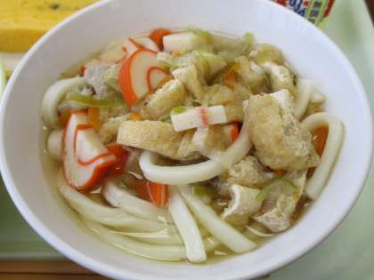 5月18日今日の献立は、ごはん、牛乳、かやくうどん、えごま入り卵焼き、おひたし、しそかつおふりかけです。卵焼きには、富山市が特産化に取り組んでいるえごまが入っています。かやくうどんは5種類の具がたっぷり入っています。ごはんと麺でおなかいっぱいです。ごちそうさまでした。