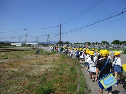 緑、ピンク、黄、赤コースの順に見て回ります。畑や田んぼが多いですね。歩道に沿って、並んで進みます。