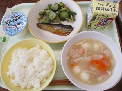 5月27日今日の献立は、ごはん、牛乳、いわしの生姜味、茎わかめサラダ、白玉汁、ヨーグルトです。白玉汁は、白玉団子や野菜がたっぷり入り、具だくさんです。物価上昇は給食の食材にも影響していて、たまねぎは量を減らし他の野菜で補っています。今日もおいしくいただきました。
