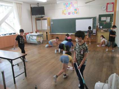 時間を見て、声を掛け合いながら掃除に取り組んでいます。 隅々まで綺麗にしています。