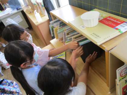 5月31日(火)1年生 自分からお仕事 公開日 2022/06/02 更新日 2022/06/02 2023年度 1年生 崩れていた本を、きれいに整頓している様子が見られました。 みんなのためにできることを、進んで取り組んでいてすばらしいですね。