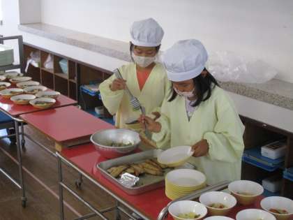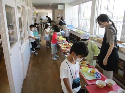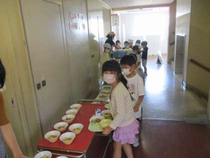 入学して早2か月がたちました。もうすっかり小学校生活にも慣れ、自分たちで給食の準備をしています。