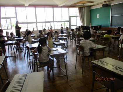 6月2日(木) 1年生「うたにあわせてリズムをうとう」 公開日 2022/06/02 更新日 2022/06/02 2023年度 1年生 音楽科では、歌に合わせてリズムを打つ学習をしています。拍に合わせて楽しそうに手拍子をしたり、足踏みで楽しさを表現したりしていました。また、みんなの代表で、一人で歌を歌ってあげたいと、歌うことに意欲を見せていました。