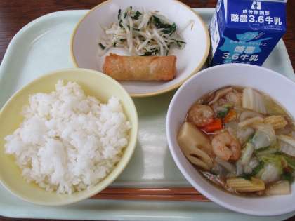 6月8日今日の献立は、ごはん、牛乳、春巻き、塩ナムル、八宝菜です。八宝菜の「八」は「たくさん」、「菜」は「おかず」という意味で、「八宝菜」は「たくさんの宝物を集めて作ったおかず」ということです。今日の八宝菜には、たまねぎ、にんじん、ピーマン、はくさい、たけのこ、しいたけ、ヤングコーン、えびの8種類の食材が入っています。具だくさんの八宝菜に満足。今日もおいしくいただきました。