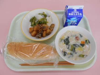 6月13日(月)今日の給食 公開日 2022/06/13 更新日 2022/06/13 給食室から 6月13日(月)今日の献立は、米粉コッペパン・牛乳・魚とレバーのえごまだれからめ・かぶのサラダ・中華クリームスープでした。レバーといえば、独特の風味があり、あまり好まれない食材の一つです。少しでも、食べやすいように、今日は、生姜としょうゆで下味を付け、油でからっと揚げてあります。甘めのたれとよくからみ、おいしかったです。