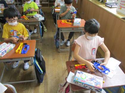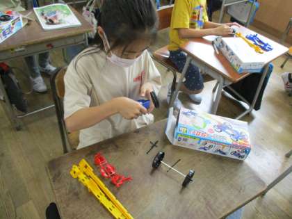 風とゴムのはたらきの学習に入りました。車を組み立てている様子です。