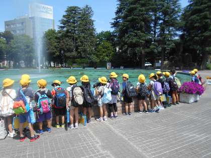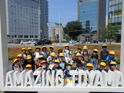 富山駅で記念撮影をしました。また、移動中には様々な場所を見学しました。途中、県庁前公園では、噴水もみました。