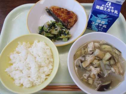 6月29日今日の献立は、ごはん、牛乳、揚げ魚のレモン味、とろろ昆布和え、なすのみそ汁です。揚げ魚は、レモン味のあんがかけてあり、さっぱりとしておいしかったです。とろろ昆布の和え物は、昆布好きの富山らしい献立ですね。今日もおいしくいただきました。