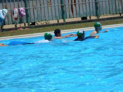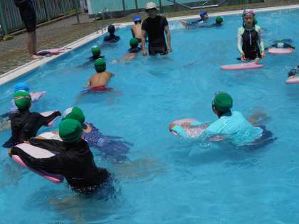 前回の学習で測定した泳力をもとに班分けし、それぞれのレベルにあった内容で泳力アップに取り組みました。