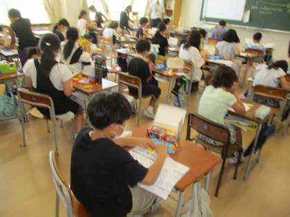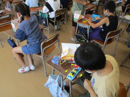 電池のはたらきについて学習するための実験道具を作っています。電池が、力(モータの回転)や光に変わり、つなげ方によっての強さが違うことを学習します。