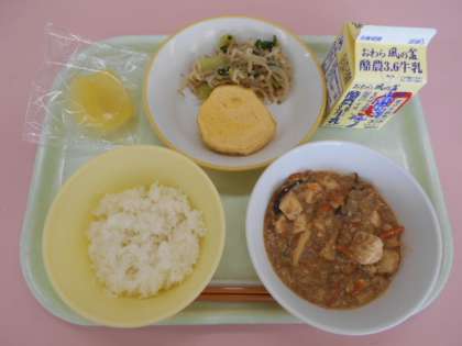 7月5日(火)今日の献立は、ごはん・牛乳・マーボー豆腐・かにたま・ナムル・冷凍りんごでした。マーボー豆腐のふるさとは、中国の四川省です。中国が清の国と呼ばれていたころ、食堂を開いていたマー婆さんが作った豆腐料理がもとになったといわれています。本場の麻婆豆腐の味の特徴は、唐辛子と山椒の辛さです。給食では、一味唐辛子を使っています。少量なので、全く辛くはありません。今日もおいしくいただきました。