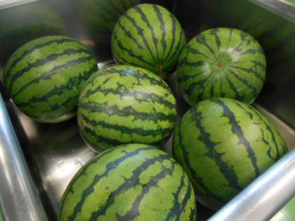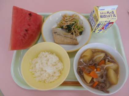 7月7日(木)今日の献立は、ごはん・牛乳・肉じゃが・鰆の塩焼き・炒り大豆和え・すいかです。今日も大きな大きなすいかが届きました。48分の1切れに切り分けました。1年生には、食べやすいように切り方を工夫していただきました。調理員さん、今日もありがとうございます。