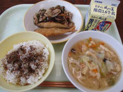 7月8日今日の献立は、ごはん、牛乳、わかさぎのフリッター、もずくのチャプチェ、具だくさん汁、しそかつおふりかけです。チャプチェは韓国の家庭料理で、春雨と野菜を甘辛く炒めた料理です。今日の給食では、春雨の代わりにもずくを使って野菜や豚肉と炒めてあります。もずくは、「酢の物」というイメージですが、炒め物にしてもおいしいですよ。今日もおいしくいただきました。