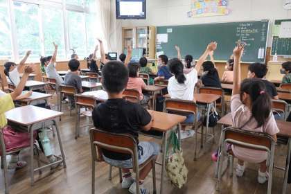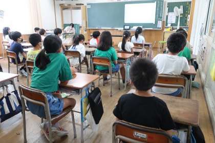 3年生です。どの学級も静かに姿勢よく話を聞いていました。