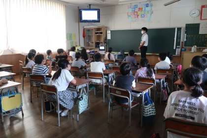 3年生です。どの学級も静かに姿勢よく話を聞いていました。