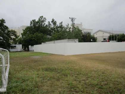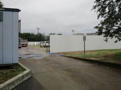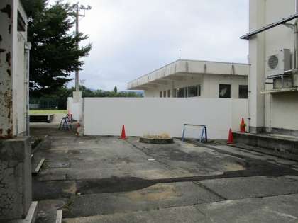 8月17日(水)より校舎耐震化補強工事3期として、旧児童玄関解体工事が始まりました。校舎内の旧児童玄関への間仕切りを終え、本日、玄関周辺、グラウンド校舎側の仮囲い設置が終わりました。工事は3月上旬まで行われます。