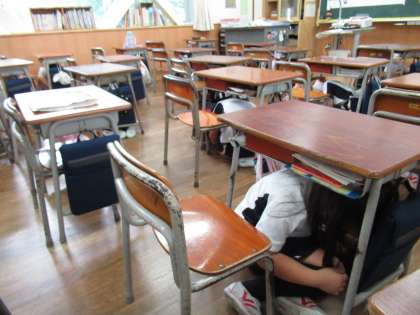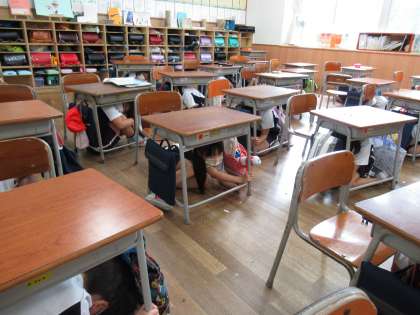 シェイクアウト訓練がありました。子供たちは、放送をよく聞き、訓練が始まると、頭や体を守るために、机の中にもぐりました。自分の命をまもるために真剣に行っていました。