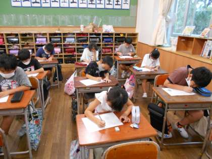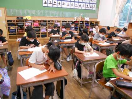 1学期に習った漢字の復習テストを行いました。集中して取り組みました。平均点で対決します。どのクラスが勝つでしょうか?