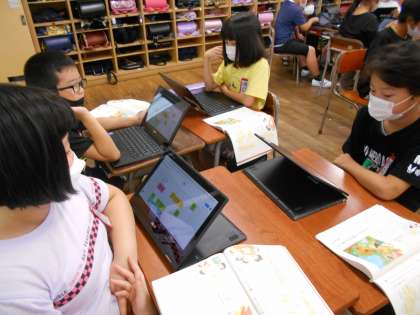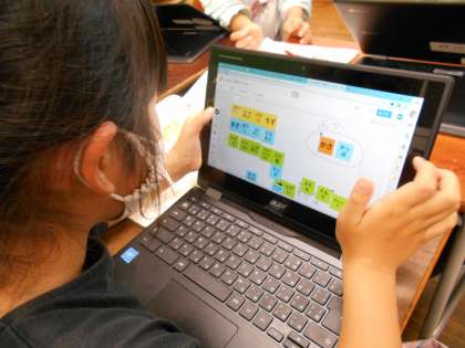 「山小屋で三日間すごすなら」というテーマで、グループの話合いを行いました。パソコンを使って意見をまとめながら考えました。