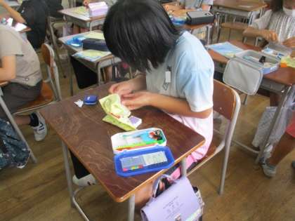 家庭科では、1学期に学習した玉留めや玉結びを確認し、なみ縫いに挑戦しました。真剣な眼差しで手縫いに挑戦していました。
