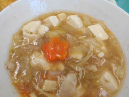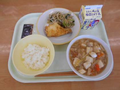 9月6日(火)今日の献立は、ごはん・牛乳・ホキの米粉揚げ・香味和え・豆腐の野菜あんかけ・のり佃煮でした。米粉揚げは、衣がさくさくしておいしかったです。豆腐のあんかけには、飾り切りの人参が入っていました。
