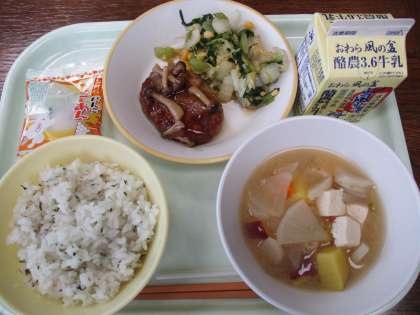 9月7日今日の献立は、菜めし、牛乳、ハンバーグのきのこソースかけ、コーン和え、さつま汁、月見大福です。9月10日は中秋の名月です。それにちなんで、デザートに月見大福が出ました。ウサギに見立てた大福は、もっちりとして甘くておいしかったです。今日もおいしくいただきました。