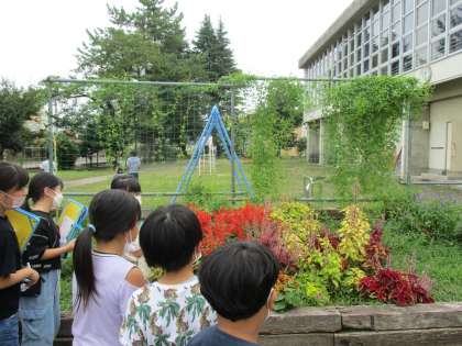 9月7日(水) 3年生 理科 公開日 2022/09/07 更新日 2022/09/07 2023年度 3年生 理科では、昆虫などの動物のすみかを探し、バッタやトンボを見つけたり捕まえたりしました。どんなところに住んでいるのか特徴を探ります。