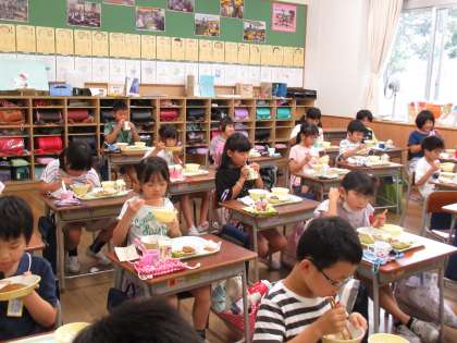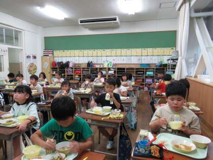 今日の給食は、子供たちの好物のハンバーグがでました。また、お月さまのようなまんまるのおもちも出ました。おいしくいただきました。