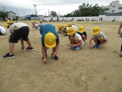 昼休みに、全校でグラウンドの草むしりをしました。2年生は、バックネット周辺をきれいにしました。