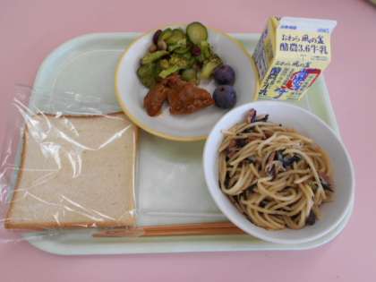 9月12日(月)今日の献立は、減量食パン・牛乳・照り焼きチキン・ビーンズサラダ・ベーコンとひじきの和風スパゲティ・巨峰でした。今日の巨峰は、長野県産の巨峰が届きました。とても甘くておいしかったです。ぶどうは、上から順番に甘くなるので、下のほうにある粒よりも、上にある粒のほうが甘そうです。