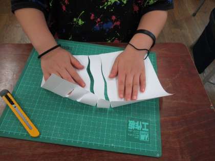 図工「まどからこんにちは」の学習で、はじめてカッターナイフを使います。今日は、その学習の前に、カッターナイフの使い方や直線の切り方などを学習しました。