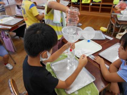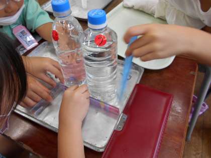 1年生は算数科の学習で、水のかさを調べ、比べ方を考えています。試行錯誤をしながら、比べ方を見付けていました。