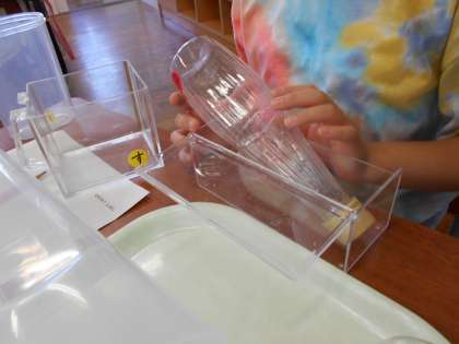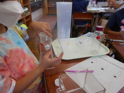 1年生は算数科の学習で、水のかさを調べ、比べ方を考えています。試行錯誤をしながら、比べ方を見付けていました。