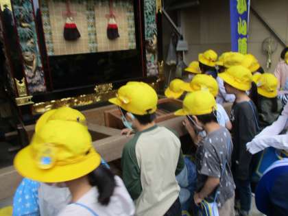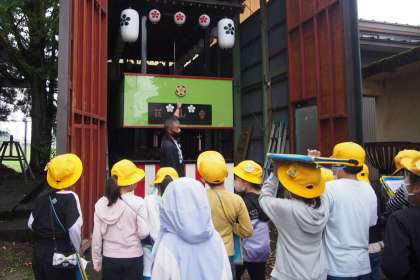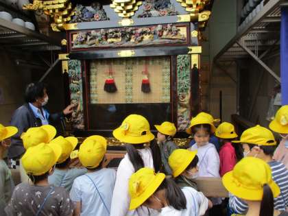 曳山を近くで見て、「お賽銭箱があったよ」「提灯をつけるんだよ」などたくさんの発見をしました。