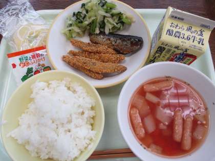 9月28日今日の献立は、ごはん、牛乳、きびなごのさくさく揚げ、いわしの土佐煮、おひたし、トマトスープ、冷凍パイン、野菜ふりかけです。臨時休業日(9月20日)に提供する予定だったいわしの土佐煮が追加になっています。トマトスープはごはんにも合うように酸味が抑えてあります。今日もおいしくいただきました。