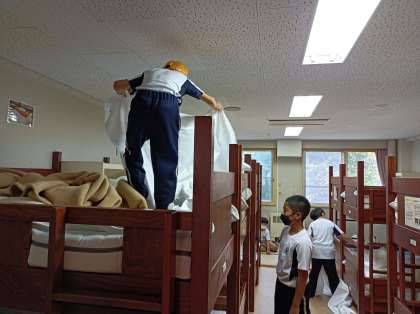 マイフォークづくりを終え、ベッドメイク中。