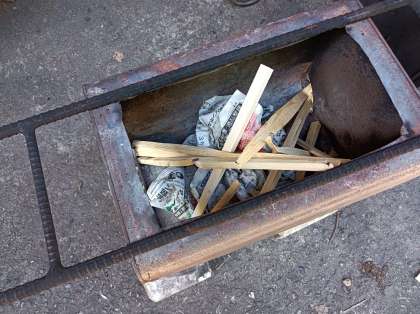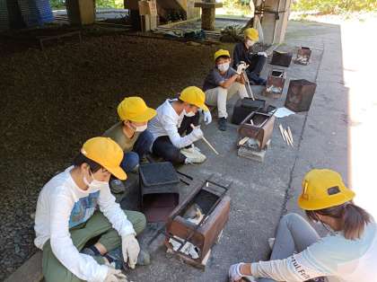 かまど班は、薪を組んで準備完了。さあ、一発で火が着くかな?
