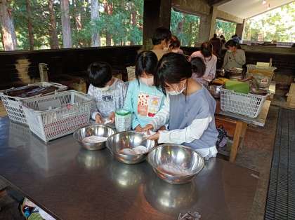 調理班は、生地やトッピングづくりです。粉や食材を分けたり、切ったりします。