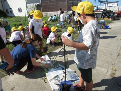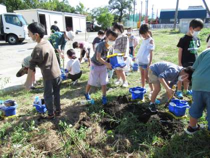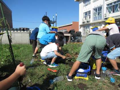 1学期から、大切に育ててきた野菜ですが、秋になり枯れてしまったり元気がなくなったりしてきました。そこで、畑に掘った穴の中にもどしました。子供たちは、その後、鉢を丁寧に洗いました。