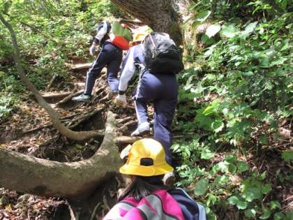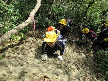 一つ目の活動の「来拝山登山」では、「ちゃんと頂上まで行けるかな」と心配そうにする様子もありましたが、お互いの体調を確認し、励まし合いながら登りました。途中、木の根っこに捕まったり、岩にしがみついたりしないと登れないような場所も、「ここに足を置くといいよ」「もう少しだよ」と、声を掛け合いました。