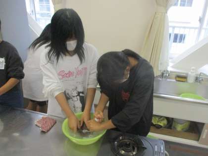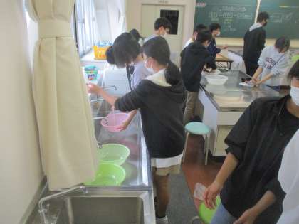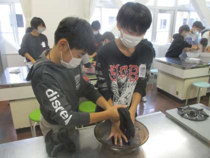 今日は、家庭科の学習で洗濯をしました。自分の家から持ってきた靴下の洗濯です。手洗いで、丁寧にもみ洗いしました。昔の人々の苦労や洗濯機のありがたみを感じることもできたと思います。
