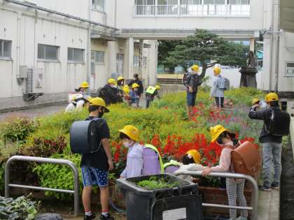 朝登校した人から花壇の草むしりをしました。 みんなで花壇を綺麗にします。