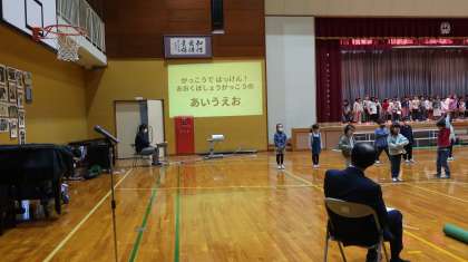 今日は、校内学習発表会でした。1年生は、生活科の学習で学校探検をしたときに発見したことを「あいうえお作文」で発表します。