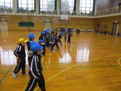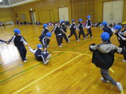 花いちもんめやビニール袋を使ってハンカチ落としをしています。
