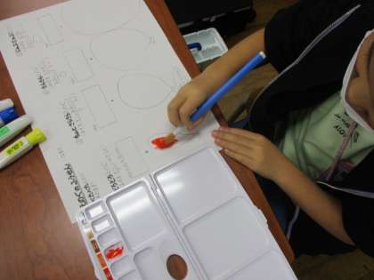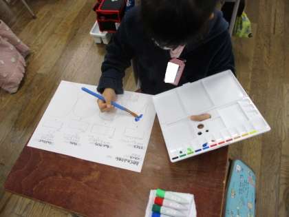 バケツの使い方や絵の具と水の混ぜ方を覚え、線からはみ出さないように取り組みました。